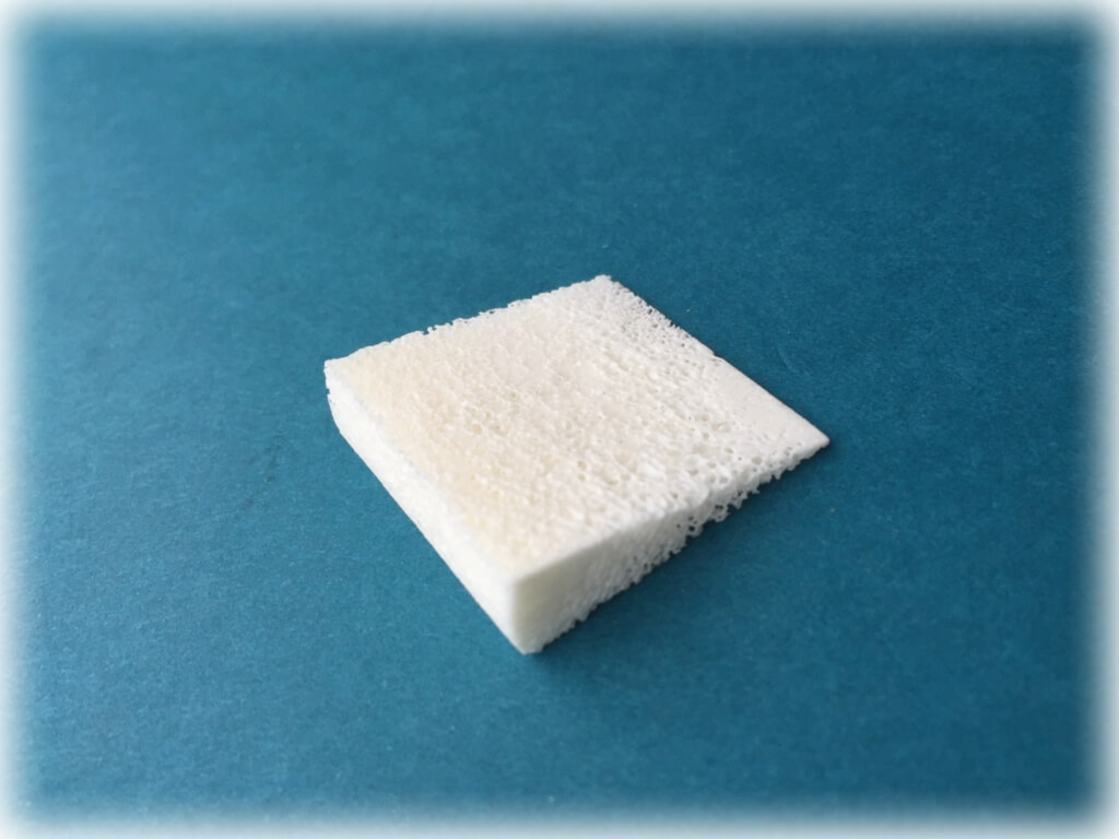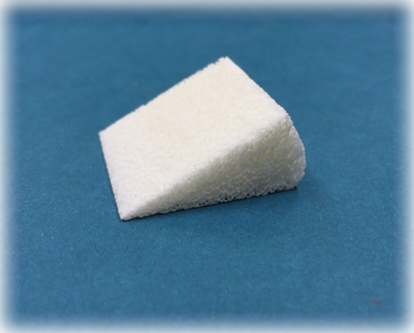 Остеокондуктивный пористый материал, имеющий макро и микро структуру схожую с человеческой костью. За счет отсутсвия антигенности и имуногенности материал характеризуется высокой биосовместимостью с костной тканью человека. Пористая структура надежно поддерживает объем имплантируемого участка, под воздействием остеокластов и остеобластов облегчает формирование образования новой кости