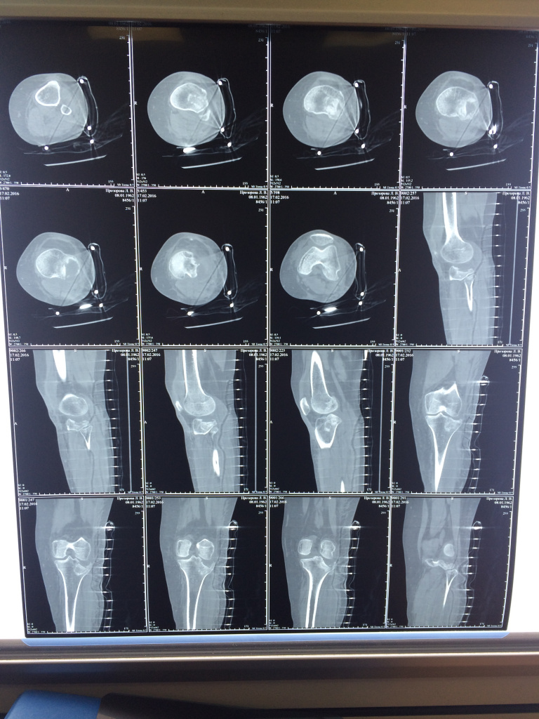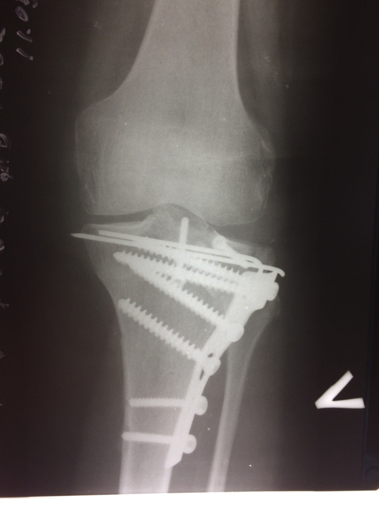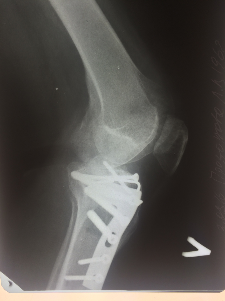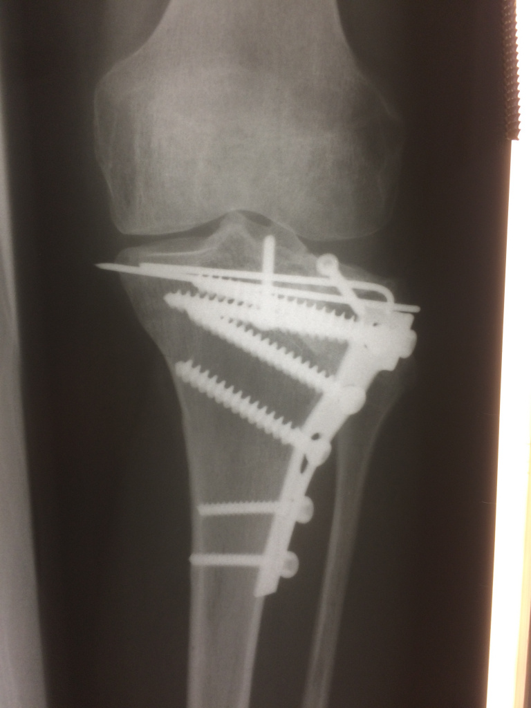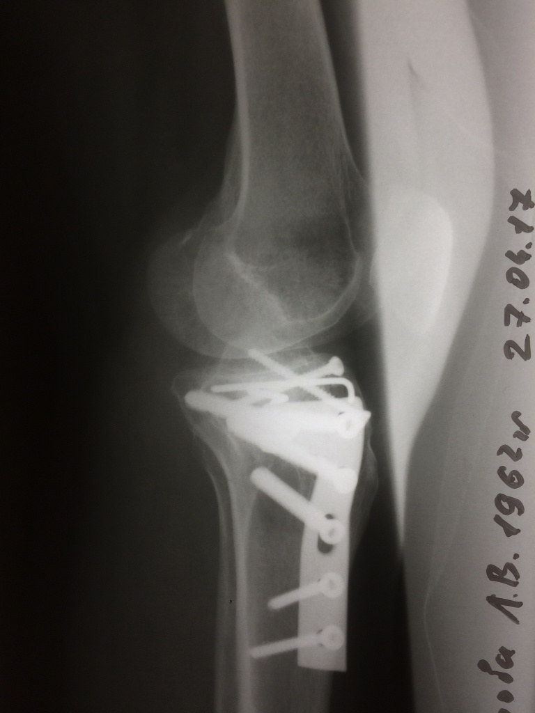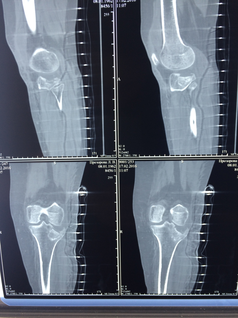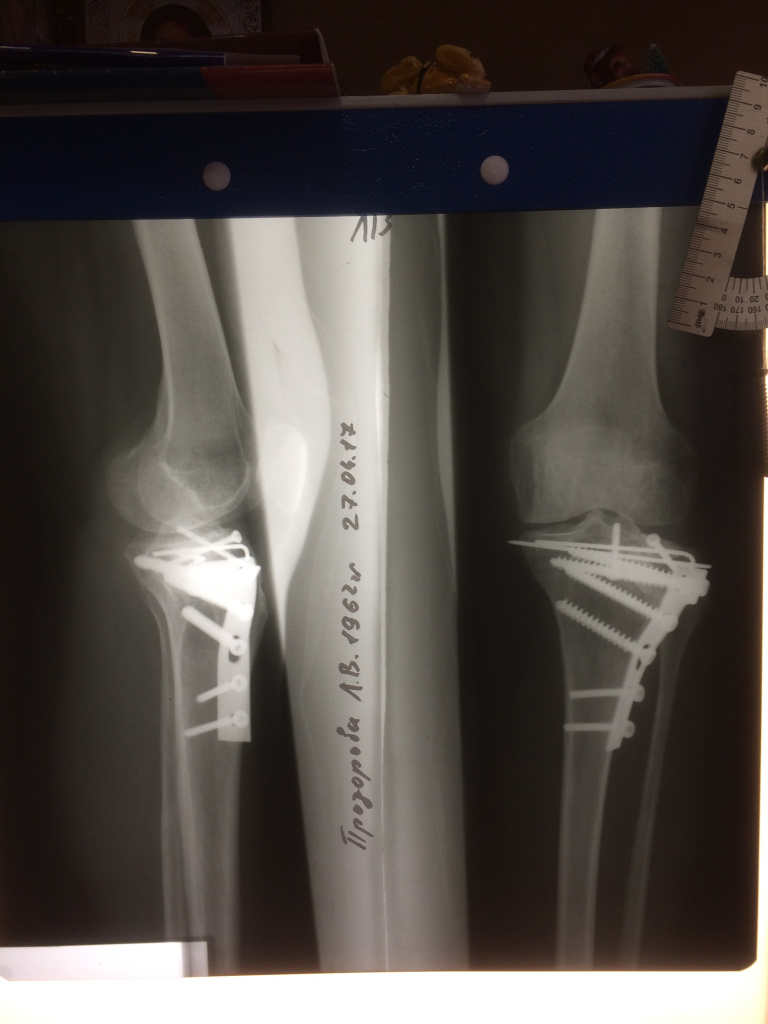 Операция - открытая репозиция, остеосинтез большеберцовой кости опорной пластиной с костной ксенопластикой маетриалом "Остеоматрикс". На контрольных снимках в три и шесть месяцев имеется консолидация перелома, миграции фиксатора нет, имеется остеоинтеграция ксенопластического материала. Функция коленного сустава полная.