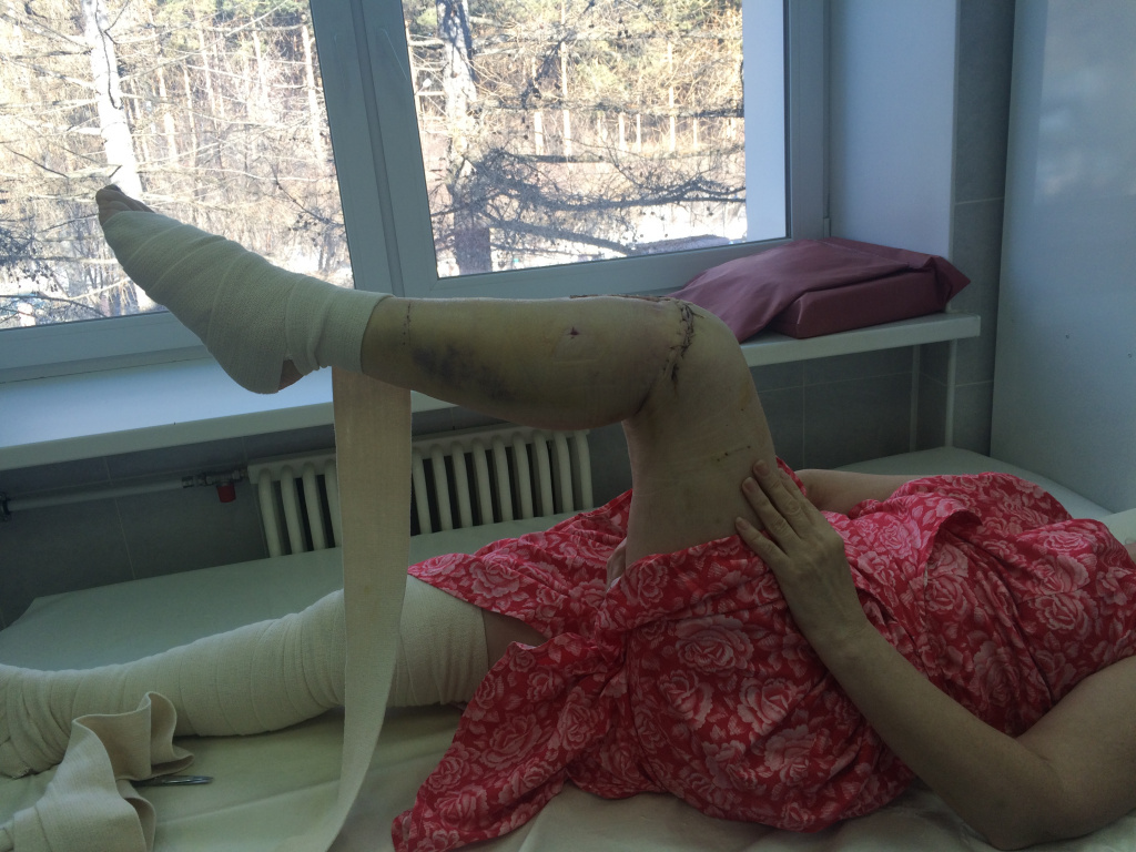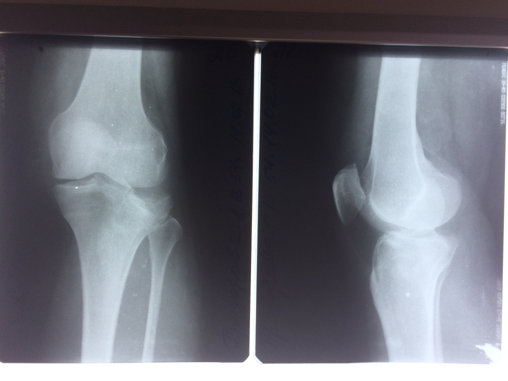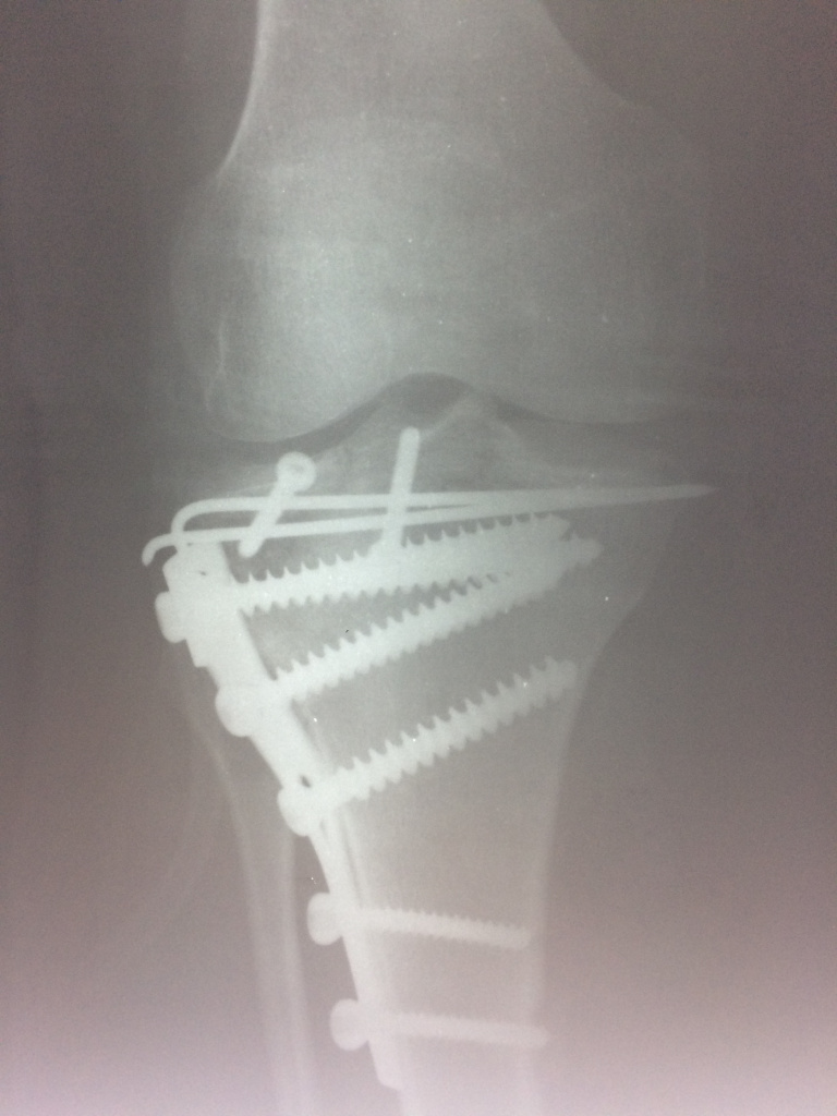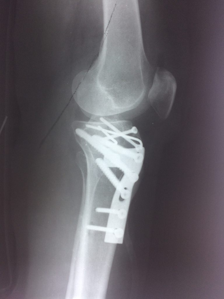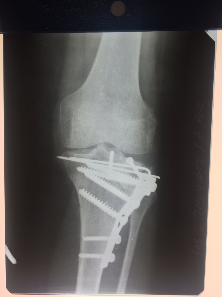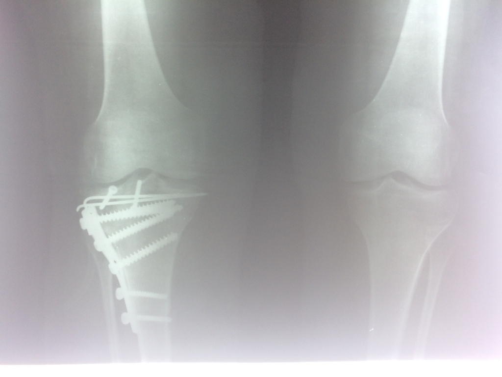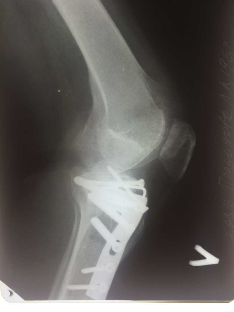 Операция - открытая репозиция, остеосинтез большеберцовой кости опорной пластиной с костной ксенопластикой маетриалом "Остеоматрикс". На контрольных снимках в три и шесть месяцев имеется консолидация перелома, миграции фиксатора нет, имеется остеоинтеграция ксенопластического материала. Функция коленного сустава полная.