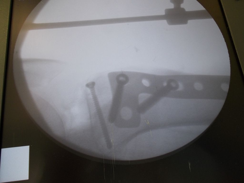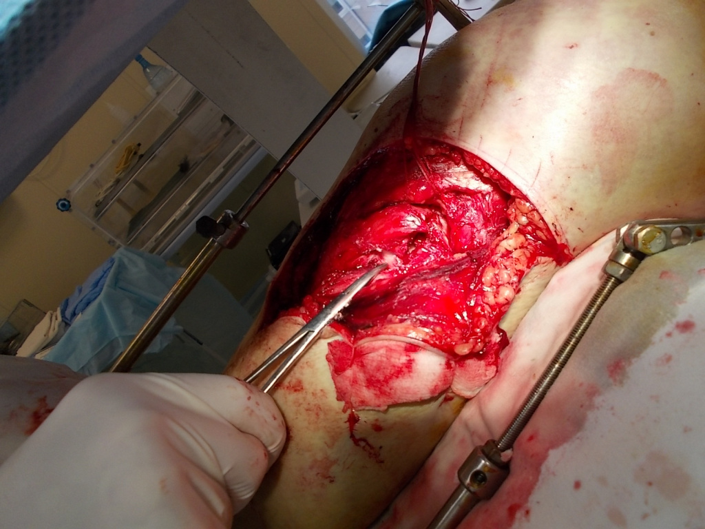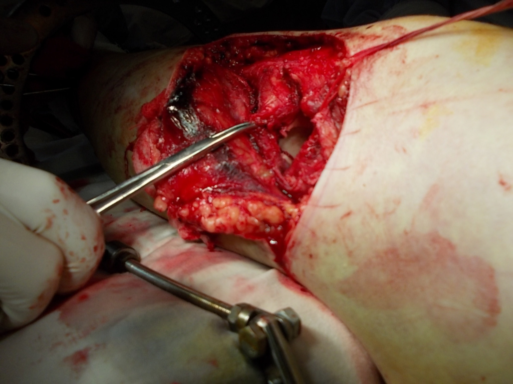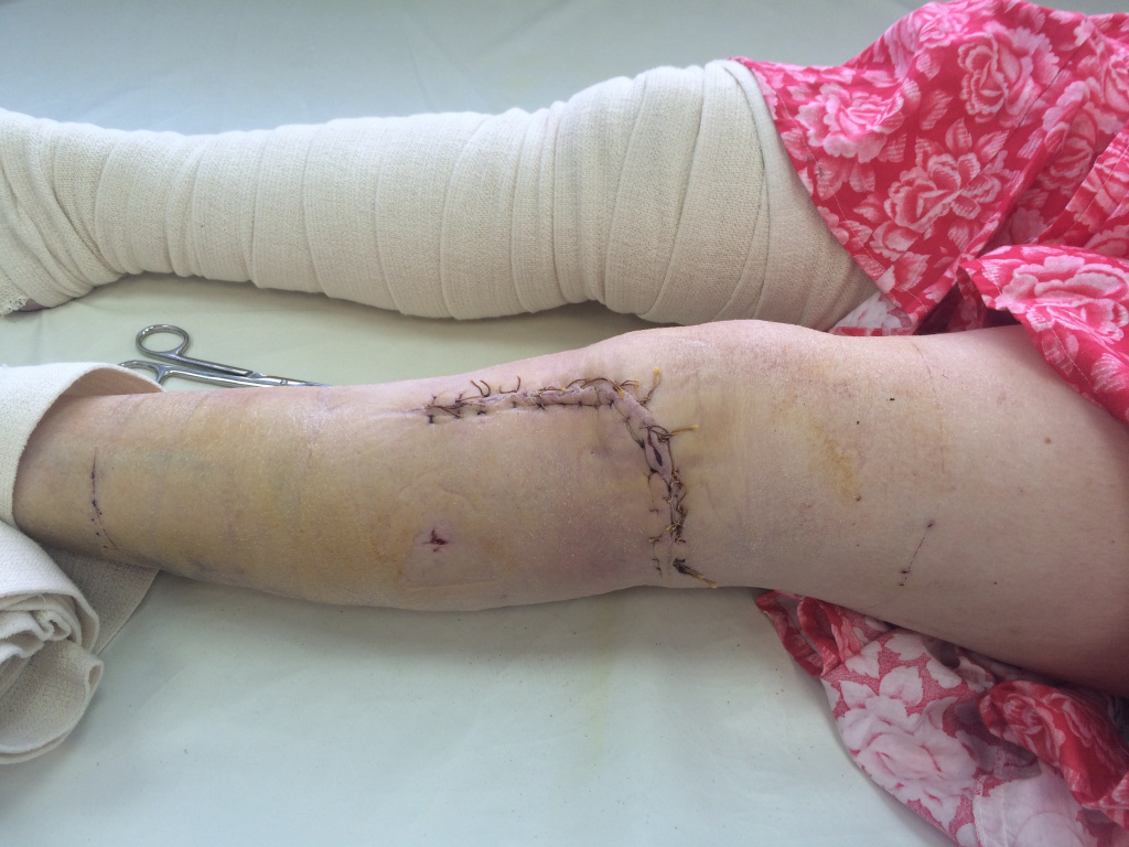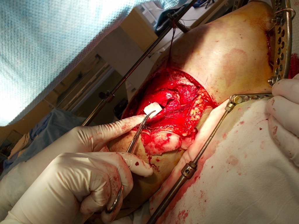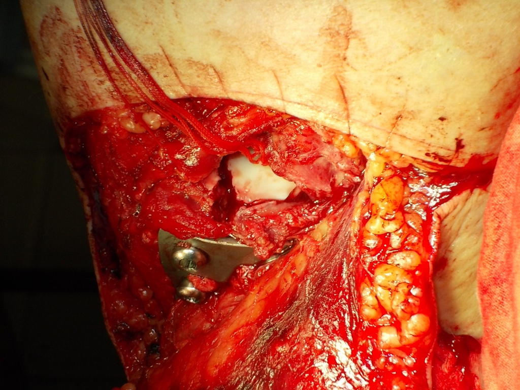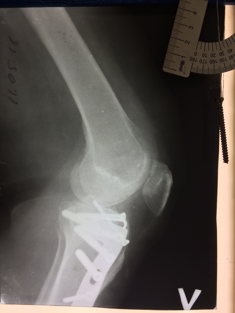 Операция - открытая репозиция, остеосинтез большеберцовой кости опорной пластиной с костной ксенопластикой маетриалом "Остеоматрикс". На контрольных снимках в три и шесть месяцев имеется консолидация перелома, миграции фиксатора нет, имеется остеоинтеграция ксенопластического материала. Функция коленного сустава полная.