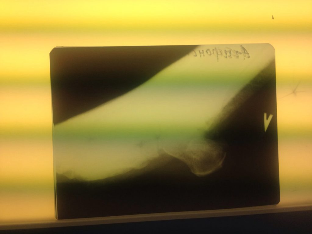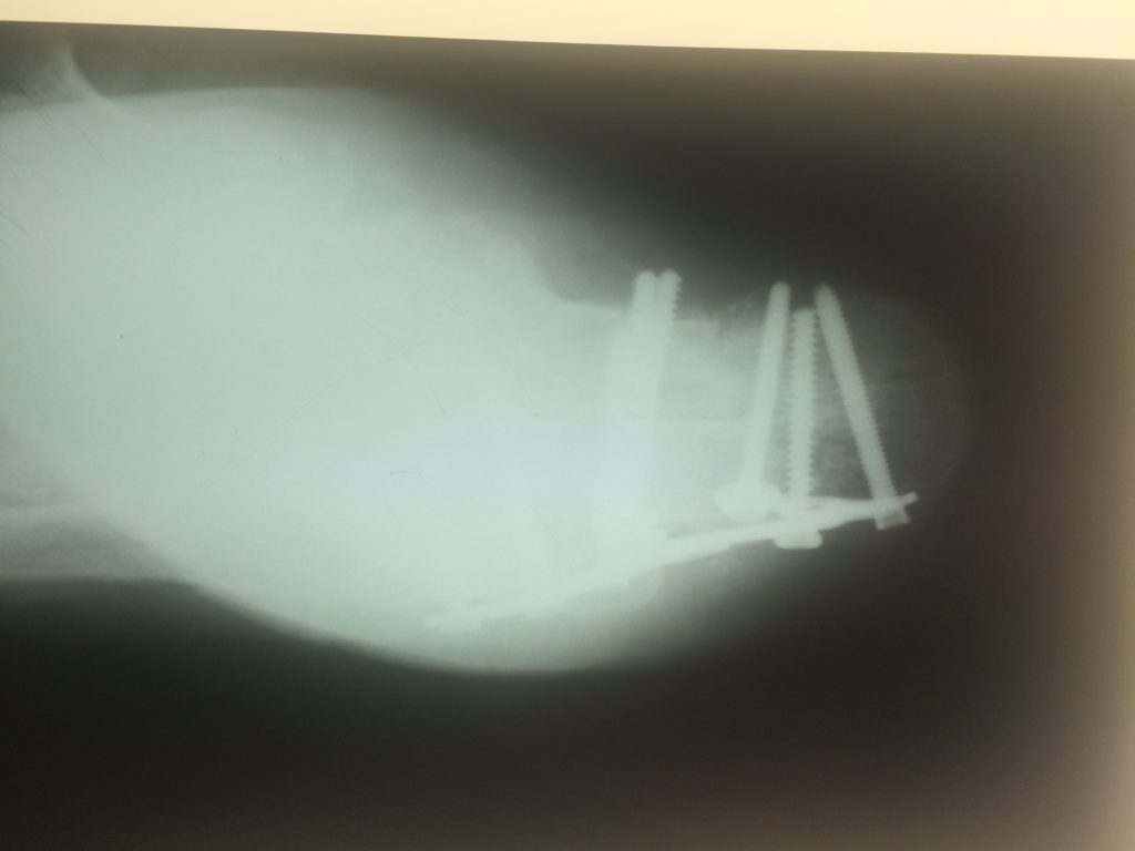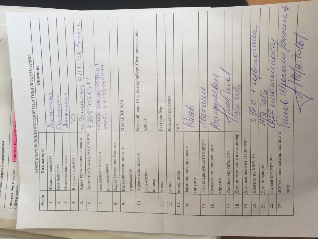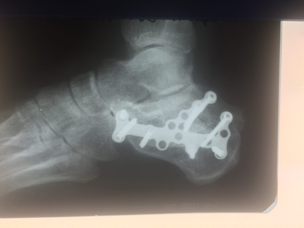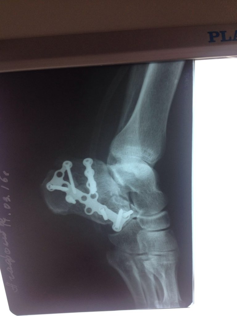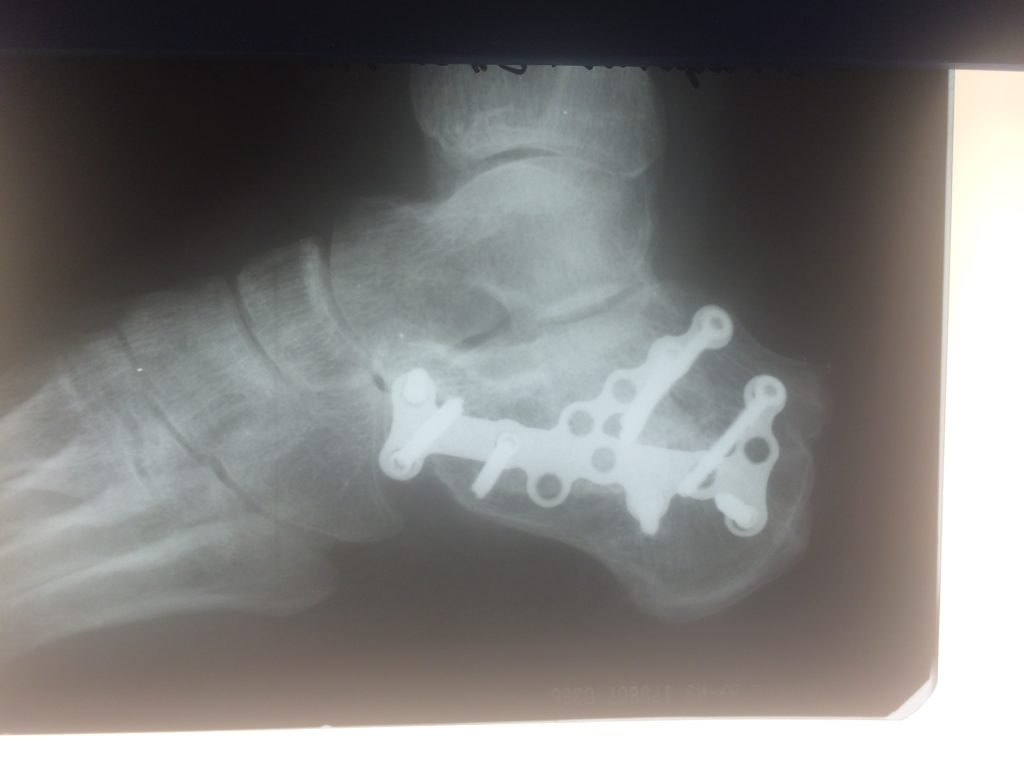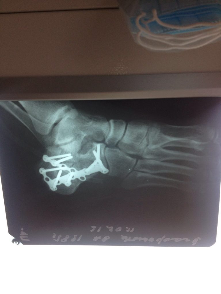 Операция – открытая репозиция, остеосинтез пяточной кости пластиной с костной ксенопластикой материалом «Остеоматрикс». На контрольных снимках в три месяца имеется консолидация перелома, миграции фиксатора нет, имеется остеоинтеграция ксенопластического материала.